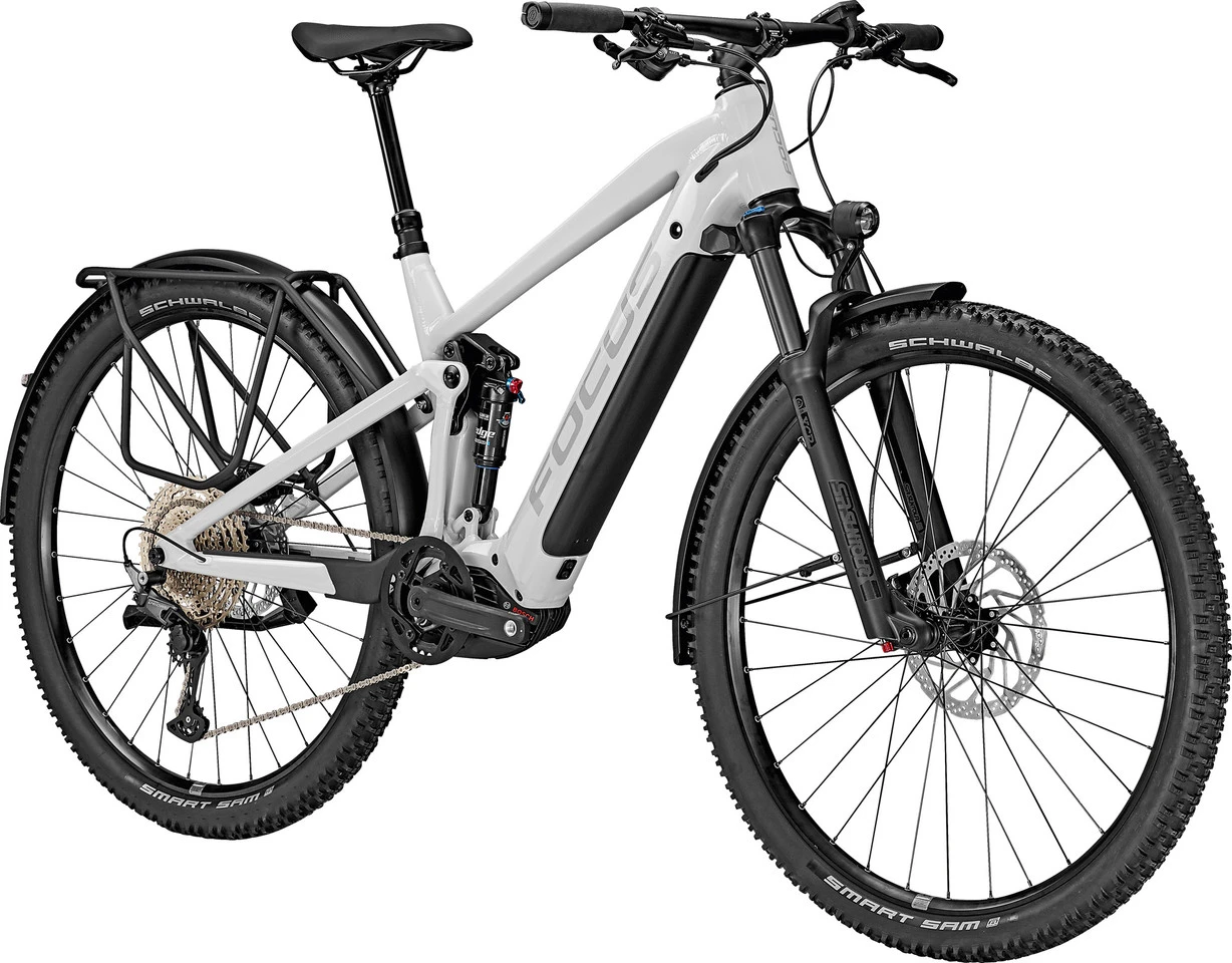 Spezifikationen:Einsatzbereich:All Mountain, Touring & Trekking, CityLaufradgröße:29″Federweg vorne:120 mmFederweg hinten:130 mmGrößen:M, L, XLMaterial Hauptrahmen:Aluminium (7005)Material Hinterbau:Aluminium (7005)E-Antrieb:Ausführung:MittelmotorMotortyp:Bosch Performance CX Gen4, 85 NmUnterstützung max.:25 km/hLeistung:250 WAkkutyp:Bosch Powertube, 36 V, abnehmbar, abschließbarKapazität:625 Wh (16,7 Ah)Display:Bosch PurionKomponenten:Rahmen:FOCUS THRON², hydrogeformtes Aluminium, 3D-geschmiedet, F.O.L.D.-Kinematik, interne Kabelführung, Postmount 180 mm, 12 x 148 mm Steckachse (Boost)Gabel:SR Suntour XCR 34 Air, LOR, 51 mm Vorlauf, 15 x 110 mm (Boost)Vorbau:FOCUS, Aluminium, 17°, 31,8 mmLenker:FOCUS, Flat, 9° Backsweep, 31,8 mmGriffe:FOCUSDämpfer:Suntour Edge LOR, 190 x 45 mm, Hardware: 25,0 x 8 mmRemote System:ohneSteuersatz:VP Components ZS56/28,6-ZS56/40Sattelstütze:Post Moderne Dropper Post PM-214, 31,6 mm, Einstecktiefe min. 100 mmSattel:Selle Royal VivoKurbel:FSA CK-320, Aluminium, Innenlager integriert in Motoreinheit, 34 Z KettenblattPedale:MTB, mit ReflektorenBremsen:Shimano MT420, hydraulische Scheibenbremse, 4 Kolben, 203 mm/180 mmSchalthebel:Shimano Deore M5100, 11-fachSchaltwerk:Shimano Deore RD-M5100Kassette:Shimano Deore CS-M5100, 11-fach, 11-51 ZKette:Shimano CN-HG601, 11-fachFelgen:RODI TRYP25, geöst, 25-622Speichen:Niro, schwarzVorderradnabe:Shimano Alivio MT400, 15 x 110 mmHinterradnabe:Shimano Alivio MT400, 12 x 148 mmReifen Vorderrad:Schwalbe Smart Sam 2,25″ , 57-622Reifen Hinterrad:Schwalbe Smart Sam 2,25″ , 57-622Freigaben:Gewichtsbeschränkung:135 kgBremsscheibengröße max.:203 mm (HR)Reifengröße max.:29 x 2,3″Kettenblattanzahl:1-fachKettenblattgröße max.:1-fach 36 ZFeatures:vielseitiges Pedelec mit 130 mm F.O.L.D.-Kinematik für Trails, Touren, Bikepacking und PendelfahrtenEQP-Version: komplett alltagstauglich ausgerüstetBosch CX E-Antrieb und 625-Wh-Akku, zum Laden entnehmbar120 mm SR Suntour FedergabelSchutzblech-Set von Büchel, Aluminium, 60 mm, pulverbeschichtetMassload Gepäckträger, 3 Streben, 25 kg ZuladungUrsus Hinterbauständer, einstellbar, 40-mm-AufnahmeLitemove SE70 Frontlicht, 70 LuxHerrmans H-Trace Mini RücklichtOption auf integrierte Kabelverlegung im Cockpit (C.I.S.)EN-Klassifikation 2: Fahrrad / Pedelec für Freizeitfahrten unter moderater Anstrengung, für befestigte Oberflächen und unbefestigte Straßen oder Schotterwege moderater Einstufung, Drops von höchstens 15 cm, Durchschnittsgeschwindigkeit 15 bis 25 km/hTechnologie:FOCUS Optimized Linkage Design (F.O.L.D.)