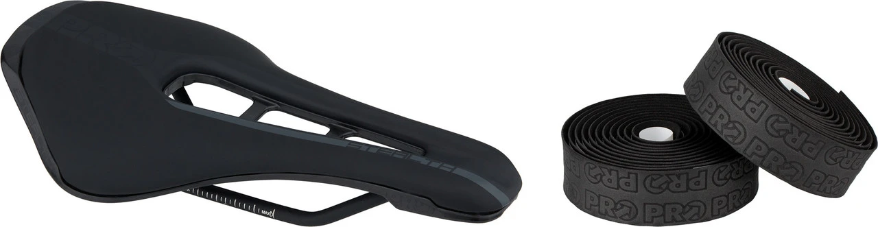 Dieses Bundle besteht aus dem PRO Stealth Rennrad-Sattel mit extragroßer Aussparung zur Druckentlastung und dem Sport Control Lenkerband in der Team Version mit eingeprägten Markenlogos.