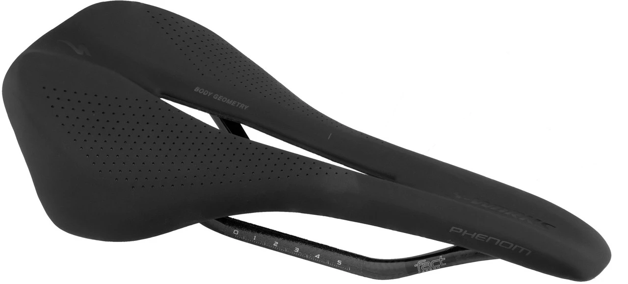 Der S-Works Phenom Sattel von Specialized für Road- und Offroad-Rennen besticht mit besonders geringem Gewicht und hoher Steifigkeit. Er wurde mit einer Sattelschale aus sorgfältig ausgewählten und fachkundig verarbeiteten Carbonfasern (FACT™-Technologie) sowie mit Oversize-Streben aus Carbon ausgestattet. Dank Body Geometry Design inklusive schmaler Aussparung in der Mitte ist die arterielle Durchblutung im empfindlichen Sitzbereich zu jedem Zeitpunkt gewährleistet. Der Sattel wurde mittelstark gepolstert, um auch bei längeren Fahrten eine optimale Balance zwischen Dämpfung und Feedback herzustellen. In der Schale befinden sich Gewinde, die das Anbringen von Specialized SWAT™-Zubehör erlauben.